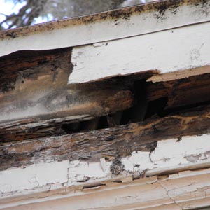 On this call, the bees were spotted going in and out of a hole up near the rain gutter of a two story house. Once the gutter and drain pipe were removed, you could see the damage and rotted wood, which