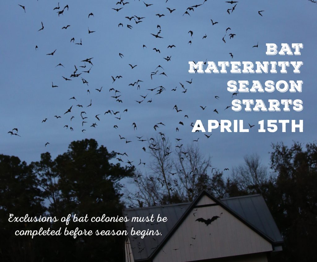 It’s time to evict your uninvited bat guests! Bat maternity season begins April 15th and runs through August 15th. Exclusions of bat colonies must be completed before maternity season arrives. What happens is, bats will be giving birth to their young. From that time forward, until the young bats can fly on their own and feed themselves. It is not legal to exlude bats out of buildings during maternity season This is in order to prevent any young bats that can not yet fly from– getting stuck and trapped inside structures and dying.